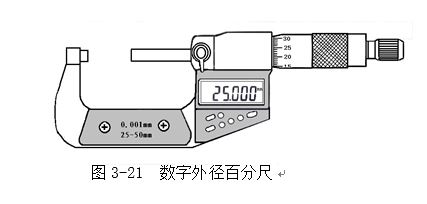 近来,我国有数字外径百分尺(图3-21),用数字表示读数,使用更为方便。还有在固定套筒上刻有游标,利用游标可读出0.002或0.001mm的读数值。