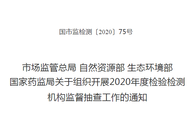 2020年5月14日,市场监管总局、自然资源部、生态环境部、国家药监局联合发布了《关于组织开展2020年度检验检测机构监督抽查工作的通知》。通知显示,为加强检验检测机构监管,营造公平有序的市场环境,为疫情防控和经济社会发展提供技术支撑,市场监管总局、自然资源部、生态环境部和国家药监局决定于2020年6月至10月在全国范围内组织开展检验检测机构“双随机、一公开”监督抽查。