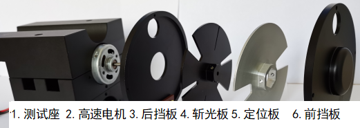 1测试座、 2高速电机、3后防护挡板、4斩光板、5定位板和6前防护挡板