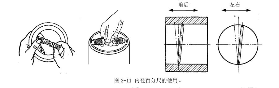 内径百分尺上,没有测力装置,测量压力的大小完全靠手中的感觉。测量时,是把它调整到所测量的尺寸后(图3-11),轻轻放入孔内试测其接触的松紧程度是否合适。一端不动,另一端作左、右、前、后摆动。左右摆动,必须细心地放在被测孔的直径方向,以点接触,即测量孔径的最大尺寸处(最大读数处),要防止如图3-12所示的错误位置。前后摆动应在测量孔径的最小尺寸处(即最小读数处)。按照这两个要求与孔壁轻轻接触,才能读出直径的正确数值。测量时,用力把内径百分尺压过孔径是错误的。这样做不但使测量面过早磨损,且由于细长的测量杆弯曲变形后,既损伤量具精度,又使测量结果不准确。