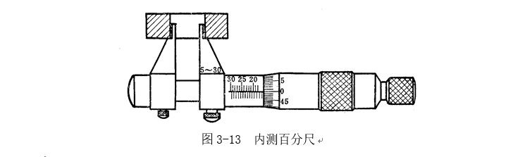 内测百分尺如图3-13所示,是测量小尺寸内径和内侧面槽的宽度。其特点是容易找正内孔直径,测量方便。国产内测百分尺的读数值为0.01mm,测量范围有5~30和25~50mm的两种,图3-13所示的是5~30mm的内测百分尺。内测百分尺的读数方法与外径百分尺相同,只是套筒上的刻线尺寸与外径百分尺相反,另外它的测量方向和读数方向也都与外径百分尺相反。