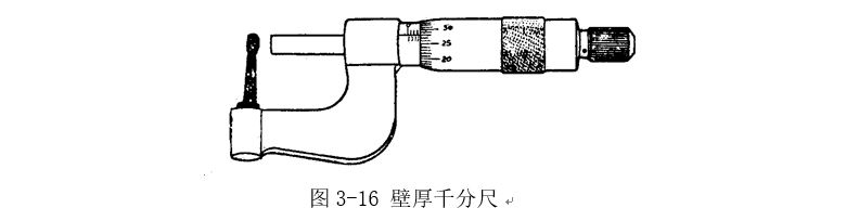 壁厚千分尺如图3-16所示。主要用于测量精密管形零件的壁厚。壁厚千分尺的测量面镶有硬质合金,以提高使用寿命。