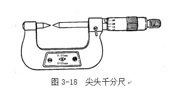 尖头千分尺如图3-18所示,主要用来测量零件的厚度、长度、直径及小沟槽。如钻头和偶数槽丝锥的沟槽直径等。