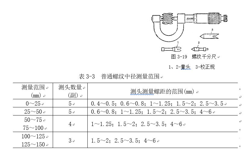 螺纹千分尺的结构与外径百分尺相似,所不同的是它有两个特殊的可调换的量头1和2,其角度与螺纹牙形角相同的。测量范围与测量螺距的范围见表3-3 。