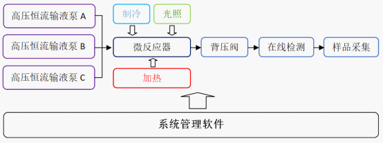 如图所示,物料通过高压输液泵输送到微反应器中,在高压密闭的微通道管路中,通过温度控制,,使合成反应能够快速完成并极大提高收率,背压阀能够人为控制反应器内压力,物料在出口处通过在线检测器检测合成结果,经过检测后的产品可通过样品采集器按预设的收集条件收集到不同的容器中。整个反应系统可通过管理软件实现自动控制,具有方法建立、模块搭建、模块参数设置,全反应过程参数实时监控,数据追溯,用户管理及智能专家数据库等功能,专用管理软件可将整个反应体系效率发挥到极致。
