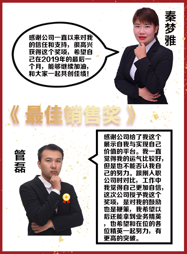 大会上,岳总经理还宣读11月份先进个人名单:业务一部胡雪成,业务二部秦梦雅,采购部曹凤勤,市场部葛格。他们在11月份评比中表现突出,成绩斐然,希望他们发挥模范带头作用,在今后工作中再创佳绩。同时,岳经理表示达成11月业绩目标离不开每一位员工的努力,勉励大家再接再厉,期待更多人加入精英队伍。