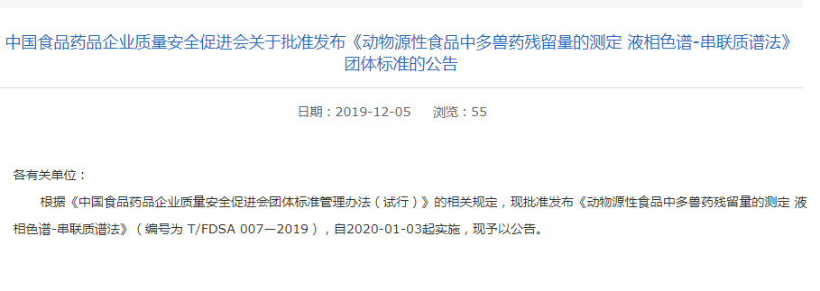 近日,中国食品药品企业质量安全促进会发布了关于《动物源性食品中多兽药残留量的测定 液相色谱-串联质谱法》团体标准的公告。公告中称,该标准将于2020年1月3号正式实施。