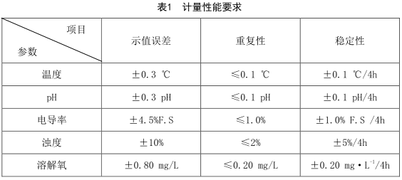 在计量器具控制面,包括首次检定、后续检定以及使用中检查。其中,在检定过程中应该满足的环境条件包括:环境温度:5 ℃~40 ℃;相对湿度:≤85%。电源条件包括:电压(220±22) V,频率(50±0.5) Hz。检定设备及标准物质包括pH溶液标准物质、电导率溶液标准物质、浊度溶液标准物质、氧气体标准物质、温度计、低温恒温水浴槽、空盒气压表、玻璃量器、制备饱和溶氧水及稀释用水、绝缘电阻表、耐压测试仪。检定项目如表2所示: