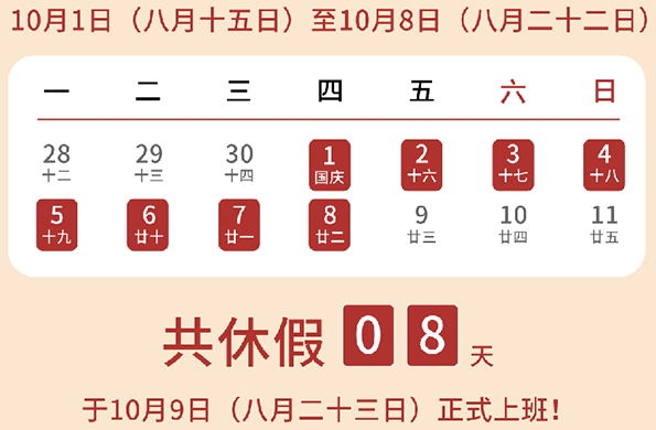 10月1日—8日放假调休,10月9日正式上班