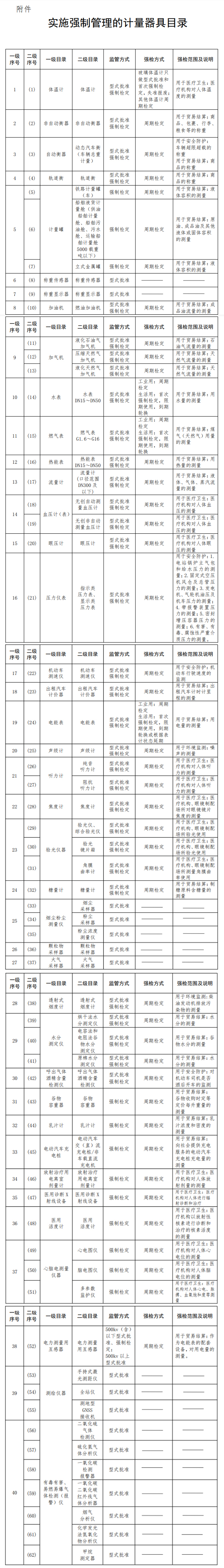 根据文件,在此次《目录》中,一级序号有40个,二级序号有62个,其中一级目录中所列设备包括:体温计、非自动衡器、自动衡器、称重传感器、流量计、机动车 测速仪、声级计、水分测定仪、透射式烟度计、有毒有害、 易燃易爆气 体检测(报 警)仪等。