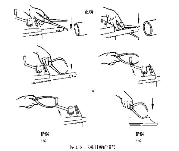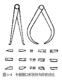 首先检查钳口的形状,钳口形状对测量精确性影响很大,应注意经常修整钳口的形状,图1-4所示为卡钳钳口形状好与坏的对比。