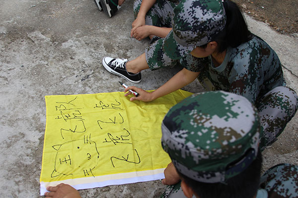 初秋天朗,骄阳未消。在拓展任务开始之前,教官将我们分成4支队伍后,各队讨论推选出队长,并设计队名、队旗、队歌和展现各队别具特色的口号。全部完成后,为期两天的团队之旅、挑战之旅、感恩之旅正式开始。