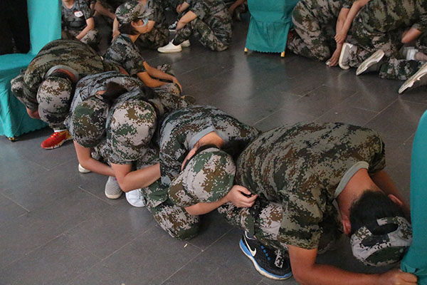 队员之间不断地产生身体接触(靠背、挽胳膊、握手),零距离接触,靠着你给我力量,我给你力量,并且团队不断地对于目标进行设定和挑战,完成了全体队员同时起立,用时1.26秒的好成绩,让团队的意识深入人心,并产生强烈的归属感。