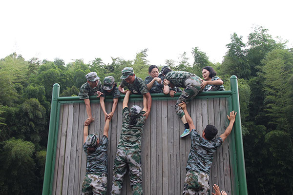 毕业墙”。所有队员在团队协作攀登4.27米的高墙。
