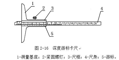 深度游标卡尺如图2-16所示,用于测量零件的深度尺寸或台阶高低和槽的深度。它的结构特点是尺框3的两个量爪连成一起成为一个带游标测量基座1,基座的端面和尺身4的端面就是它的两个测量面。如测量内孔深度时应把基座的端面紧靠在被测孔的端面上,使尺身与被测孔的中心线平行,伸入尺身,则尺身端面至基座端面之间的距离,就是被测零件的深度尺寸。它的读数方法和游标卡尺完全一样。