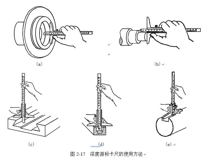 测量时,先把测量基座轻轻压在工件的基准面上,两个端面必须接触工件的基准面,图2-17(a) 所示。测量轴类等台阶时,测量基座的端面一定要压紧在基准面,图2-17(b)(c) 所示,再移动尺身,直到尺身的端面接触到工件的量面(台阶面)上,然后用紧固螺钉固定尺框,提起卡尺,读出深度尺寸。多台阶小直径的内孔深度测量,要注意尺身的端面是否在要测量的台阶上,图2-17(d) 。当基准面是曲线时,图2-17(e) ,测量基座的端面必须放在曲线的最高点上,测量出的深度尺寸才是工件的实际尺寸,否则会出现测量误差。