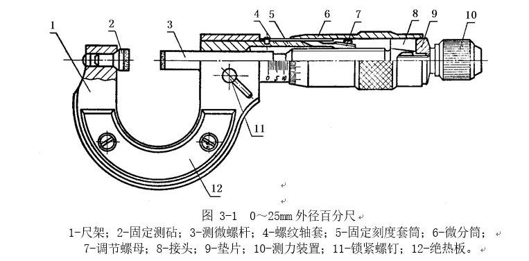 各种百分尺的结构大同小异,常用外径百分尺是用以测量或检验零件的外径、凸肩厚度以及板厚或壁厚等 (测量孔壁厚度的百分尺,其量面呈球弧形 )。百分尺由尺架、测微头、测力装置和制动器等组成。图3―1是测量范围为 0~25mm的外径百分尺。 尺架1的一端装着固定测砧2,另一端装着测微头。固定测砧和测微螺杆的测量面上都镶有硬质合金,以提高测量面的使用寿命。尺架的两侧面覆盖着绝热板12, 使用百分尺时,手拿在绝热板上,防止人体的热量影响百分尺的测量精度。