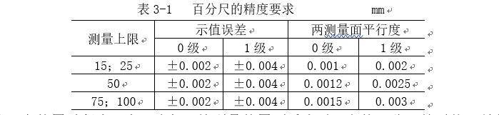 百分尺是一种应用很广的精密量具,按它的制造精度,可分0级和1级的两种,0级精度较高,1级次之。百分尺的制造精度,主要由它的示值误差和测砧面的平面平行度公差的大小来决定,小尺寸百分尺的精度要求,见表3-1。从百分尺的精度要求可知,用百分尺测量IT6~IT10级精度的零件尺寸较为合适。
