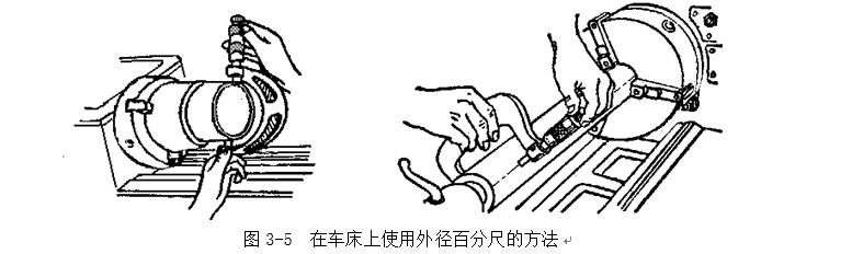 5 使用百分尺测量零件时(图3-5),要使测微螺杆与零件被测量的尺寸方向一致。如测量外径时,测微螺杆要与零件的轴线垂直,不要歪斜。测量时,可在旋转测力装置的同时,轻轻地晃动尺架,使测砧面与零件表面接触良好。