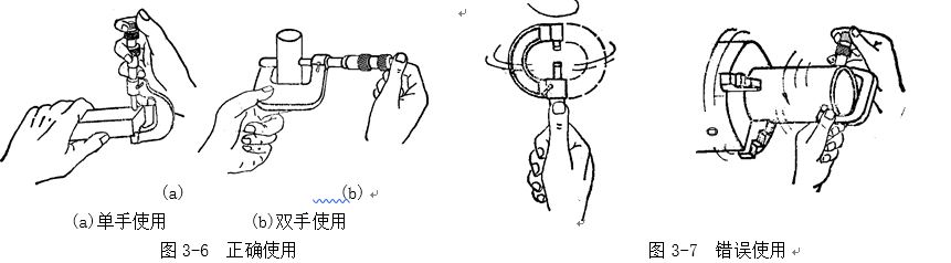 值得提出的是几种使用外径百分尺的错误方法,比如用百分尺测量旋转运动中的工件,很容易使百分尺磨损,而且测量也不准确;又如贪图快一点得出读数,握着微分筒来挥转(图3-7) 等,这同碰撞那样,也会破坏百分尺的内部结构。