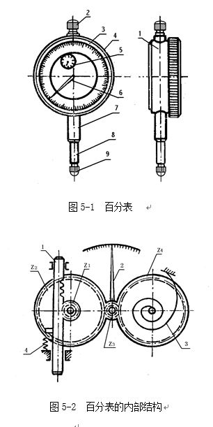 图5-2是百分表内部机构的示意图。带有齿条的测量杆1的直线移动,通过齿轮传动(Z1 、Z2 、 Z3),转变为指针2的回转运动。齿轮Z4和弹簧3使齿轮传动的间隙始终在一个方向,起着稳定指针位置的作用。弹簧4是控制百分表的测量压力的。百分表内的齿轮传动机构,使测量杆直线移动1mm时,指针正好回转一圈。