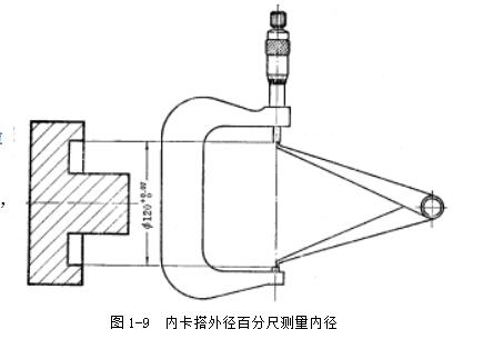 也能分辨得出。又如用内卡钳与外径百分尺联合测量内孔尺寸时,有经验的老师傅完全有把握用这种方法测量高精度的内孔。这种内径测量方法,称为“内卡搭百分尺”,是利用内卡钳在外径百分尺上读取准确的尺寸,如图1-9所示,再去测量零件的内径;或内卡在孔内调整好与孔接触的松紧程度,再在外径百分尺上读出具体尺寸。这种测量方法,不仅在缺少精密的内径量具时,是测量内径的好办法,而且,对于某零件的内径,如图1-9所示的零件,由于它的孔内有轴而使用精密的内径量具有困难,则应用内卡钳搭外径百分尺测量内径方法,就能解决问题。