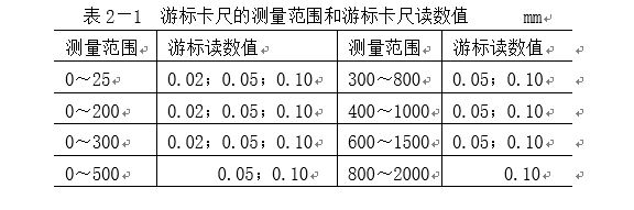 目前我国生产的游标卡尺的测量范围及其游标读数值见表2-1。