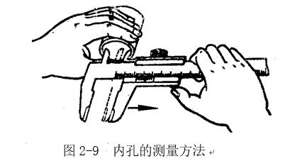 4 当测量零件的内尺寸时:图2-9所示。要使量爪分开的距离小于所测内尺寸,进入零件内孔后,再慢慢张开并轻轻接触零件内表面,用固定螺钉固定尺框后,轻轻取出卡尺来读数。取出量爪时,用力要均匀,并使卡尺沿着孔的中心线方向滑出,不可歪斜,免使量爪扭伤;变形和受到不必要的磨损,同时会使尺框走动,影响测量精度。