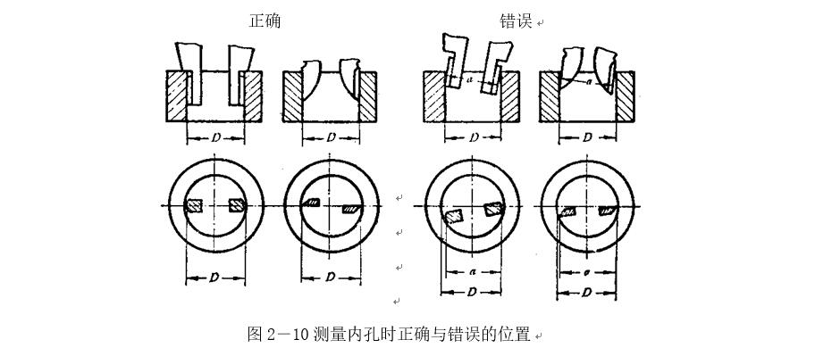 卡尺两测量刃应在孔的直径上,不能偏歪。图2-10为带有刀口形量爪和带有圆柱面形量爪的游标卡尺,在测量内孔时正确的和错误的位置。当量爪在错误位置时,其测量结果,将比实际孔径D要小。